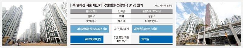 송파구 대단지 ‘헬리오시티’ 정문 전경. 2026. 02. 23 뉴시스9510채 규모 대단지인 서울 송파구 가락동 헬리오시티. 올해 1월 전용 84㎡가 최고가인 31억2500만 원에 거래됐지만 현재는 27억 원대까지 호가가 떨어졌다. 호가 기준 한 달 만에 3억 원…