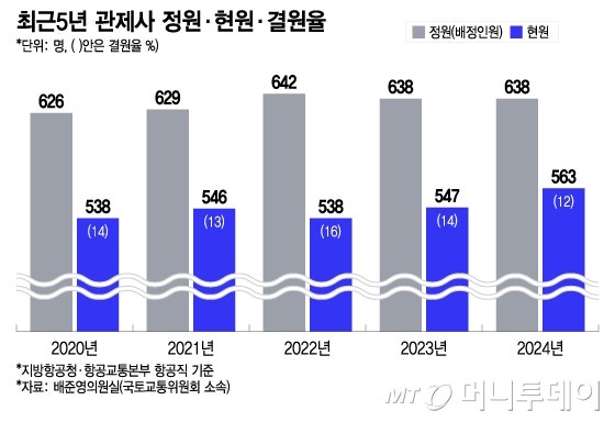 최근5년 관제사 정원·현원·결원율/그래픽=이지혜 한국 항공안전 시스템의 핵심 축인 항공관제 부문의 결원률이 12%에 달하는 등 인력난이 심각한 상태로 밝혀졌다. 현장에선 "국가 항공안전 시스템이 붕괴 직전"이라는 우려까지 나온다. 관제사 한 명이 항공기 수십 대의…