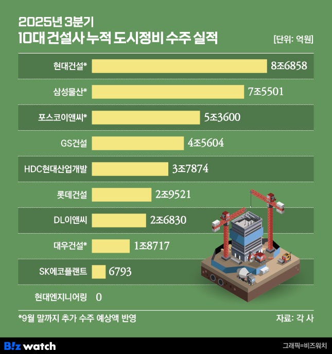 - 9월까지 도정 수주액 38조 넘길듯2.7조 압구정2, 현대건설 수의계약 여부 결정GS건설도 3개월 만에 일감 2조 이상 늘려현엔, 5개월 가까이 수주 활동 중단10대 건설사가 이달까지 38조원 이상의 재건축·재개발 일감을 확보할 전망이다. 올해 6월까지 28조원 가량이…