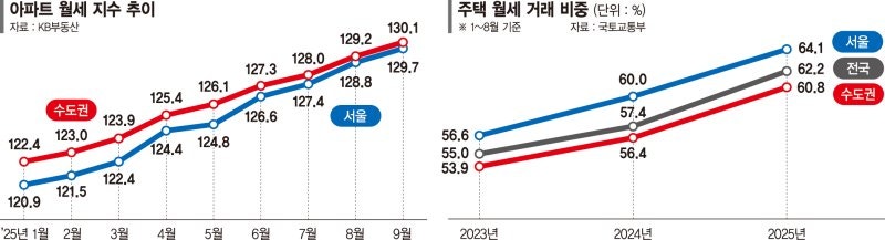- 서울 아파트 월세지수 129.7통계 작성 이래 최고치 경신대출규제·전세 신규공급 감소월세 전환 급증하며 가격 상승