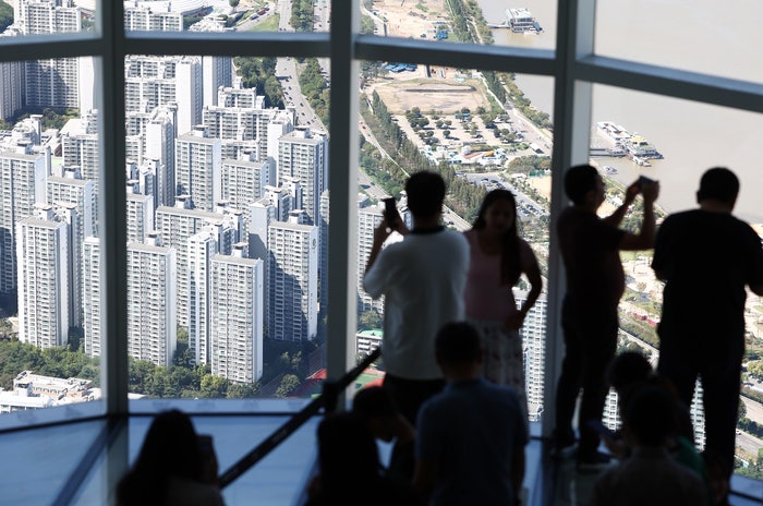 9일 서울 남산에서 사람들이 아파트 단지를 내려다보고 있다. 이날 한국은행 경제통계시스템에 따르면 7…