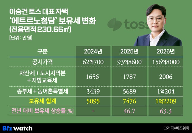- 에테르노청담 팔아 직원 10명 1년 거주비 약속공시가 '157억' 주택, 보유세도 1억 넘어100억 수익 내고?…공감 어려운 '문제의식'"누구는 부동산으로 큰 수익을 올리고, 누구는 주거비 때문에 생존의 어려움에 서는 부조리."금융 앱 '토스' 운영사 비바리퍼블리카를 …