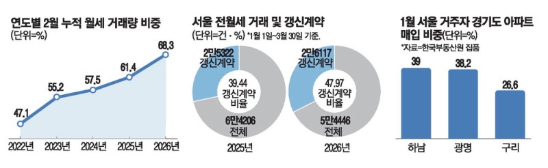- 전국 월세 비중 68.3% 돌파5년 연속 역대 최고치 경신실거주 의무·보유세 영향전세는 7년 만에 최저치로눌러앉는 전세 갱신계약 급증경기도로 이사 탈서울 늘어나