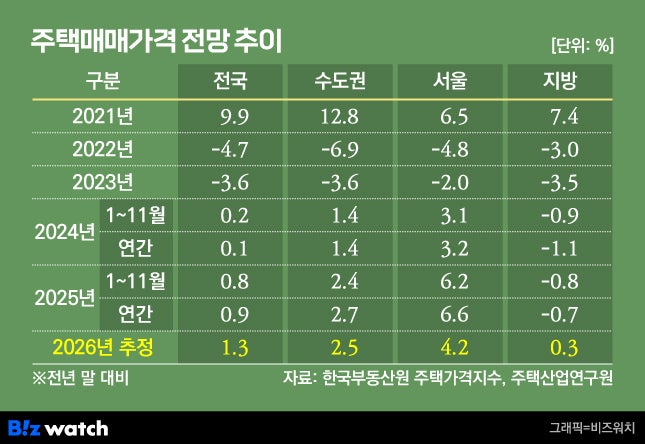 - 주산연 '2026년 주택시장 전망과 정책방향'내년 집값 전국 1.3%·지방 0.3% 상승 예측