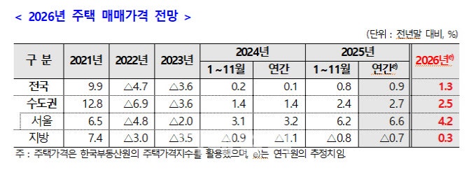 - 내년 수도권 집값은 2.5%, 서울 집값은 4.2% 오를 것이라는 전망이 나왔다. 최근 유동성 증가와 대출 금리 하락, 누적된 착공 물량 부족으로 올해의 상승 기조가 내년에도 이어질 것이라는 전망이다.주택산업연구원은 23일 ’2026년 주택 시장 전망과 정책 방향’을 …