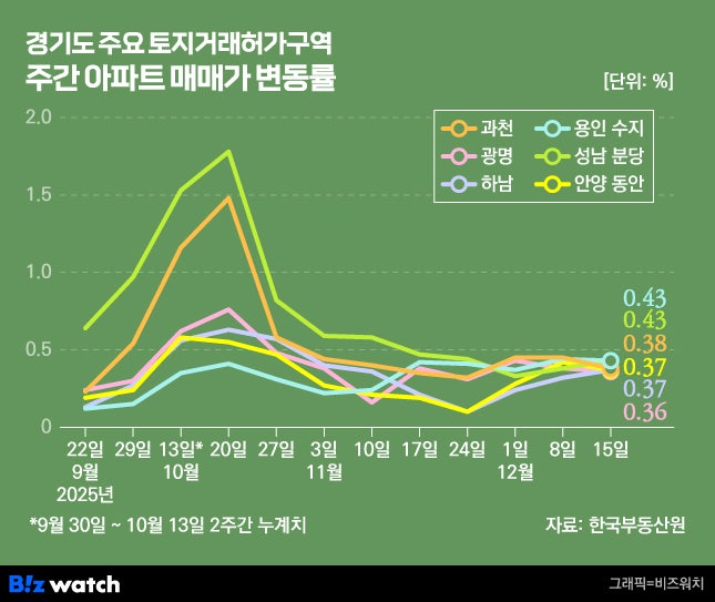 - [집값 톡톡]성남 분당 일주일 새 0.43%↑과천·평촌·광명 등 '준서울' 강세 이어져고가주택 밀집 '한강벨트'도 상승 지속정부가 집값 급등세를 가라앉히기 위해 서울 전역과 경기도 12곳을 토지거래허가구역으로 묶는 '10·15 주택 시장 안정화 대책'을 내놓은 지 2개…