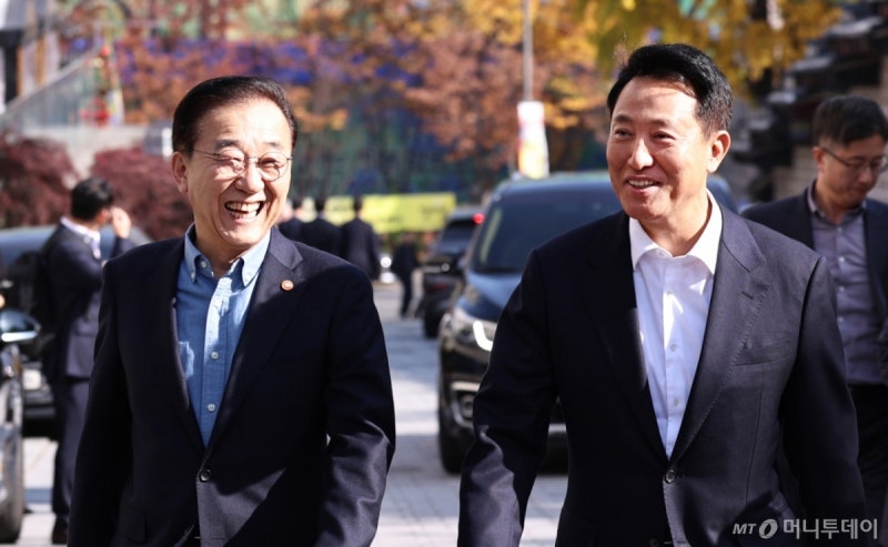 (서울=뉴스1) 구윤성 기자 = 김윤덕 국토교통부 장관(왼쪽)과 오세훈 서울시장이 13일 서울 중구의 한 한식당에서 오찬 면담을 마친 뒤 브리핑 장소로 이동하며 대화하고 있다. 2025.11.13/뉴스1 Copyright (C) 뉴스1. All rights res…