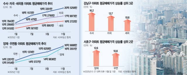 - 6·27 대책 이후 5개월 새 수서 집값 16% 상승자곡·우면동 상승률도 10% 웃돌며 두자릿수수요 몰리며 양재·우면동도 상승률 반포의 2배