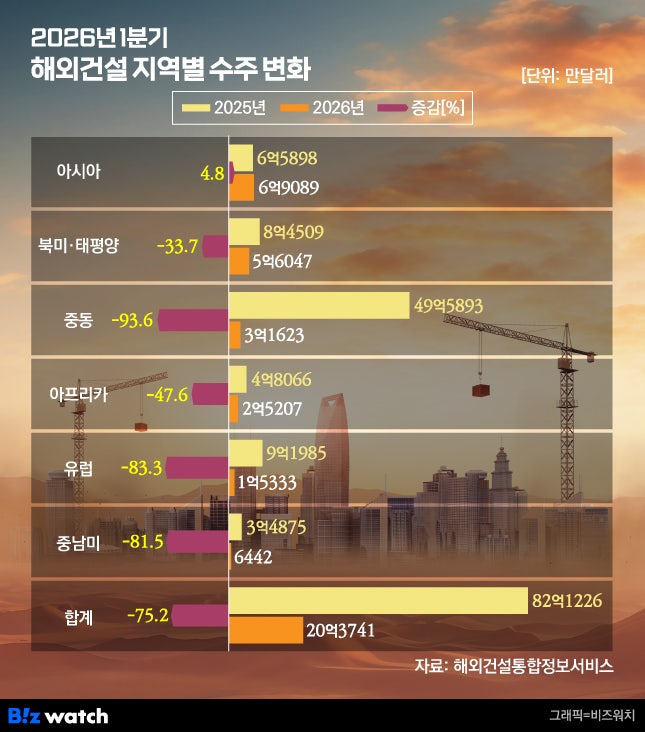 - [중동 리스크]1분기 중동 건설 수주액 전년比 93.6%↓수주 급감에 해건협 분기 보고서도 생략삼성E&A, 3조원 이상 일감 확보 예고했지만"전쟁 장기화하면 수주 차질 불가피"국내 건설업계가 해외 수주에서 극도로 부진한 첫 분기 성적표를 받았다. 업계에서는 앞으로의 일…