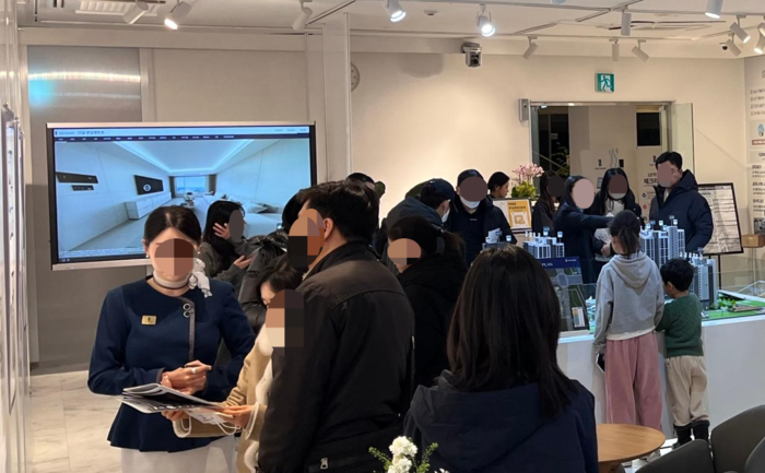 경기도 성남시 분당구 정자동에 위치한 '더샵 분당 센트로' 분양홍보관을 방문객들이 둘러보고 있다.용인 수지구와 성…
