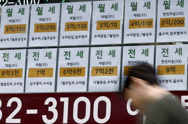 서울 강남구에 있는 한 공인중개사 사무소 유리창에 전월세 매물이 붙어 있다. / 뉴스1 임대…
