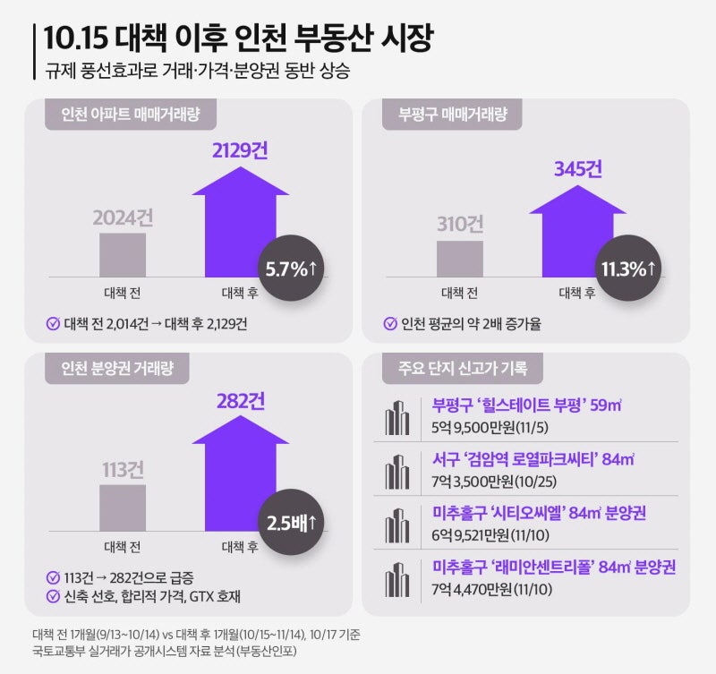 - -거래량 늘고 분양권 ‘2.5배 폭증’···규제 풍선효과에 ‘들썩’-부평·서구 곳곳 ‘신고가’···5주 연속 상승세 타며 가격도 ‘꿈틀’-서울 접근성·특화설계 갖춘 새 아파트에 수요 몰리며 ‘선점 경쟁’[서울경제] 정부가 지난 10월 15일 발표한 고강도 부동산 대책의…