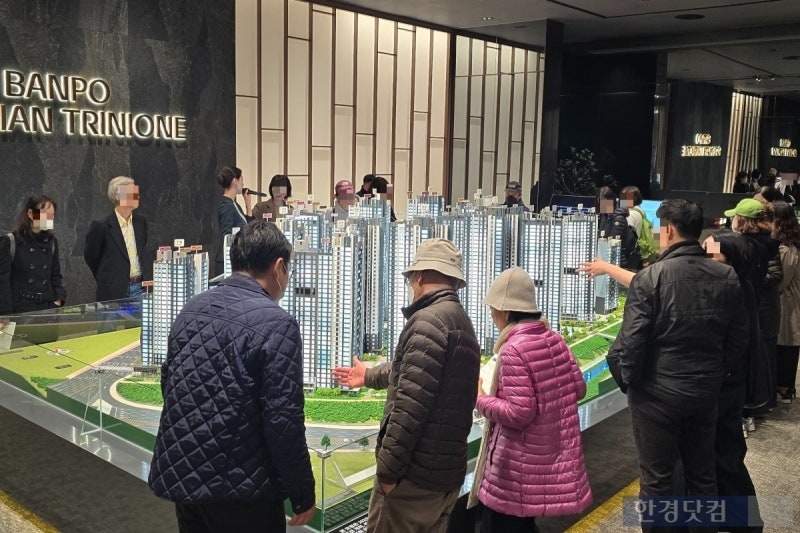 7일 오후 서울 송파구 래미안갤러리에서 시민들이 반포 래미안 트리니원 견본주택을 보고 있다. 뉴스1 서울 서초구 반포동 ‘반포 래미안 트리니원’(반포3주구 재건축)의 청약 당첨 가점이 최고 82점, 최저 70점으로 나타났다. 4인 가구 만점(69…
