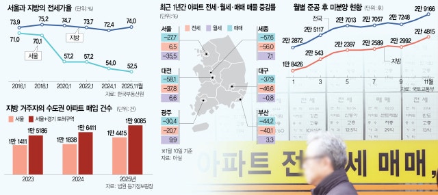 - [지방 거주자, 수도권 매수행렬]지난해 외지인 매매 1.4만건 달해경기 토허구역 포함하면 1.9만건지방 악성 미분양은 14년來 최고전세가율 격차도 22%P나 벌어져부분적 양도세 감면 등 특단책 필요