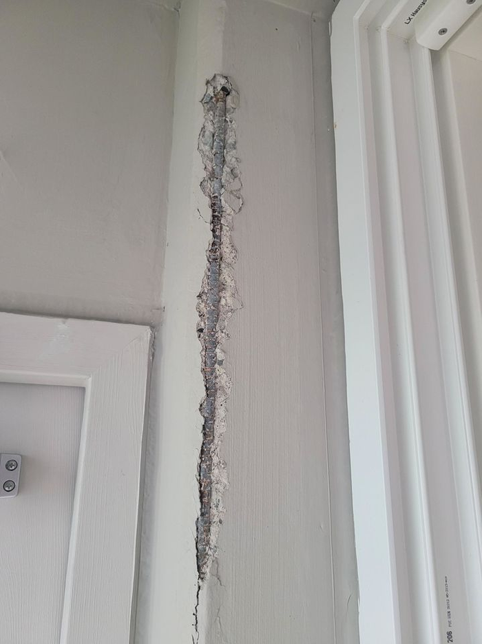 신축아파트 내부 벽이 갈라져 철근이 노출된 모습. [보배드림]입주한 지 얼마 되지 않은 신축아파트의 내부 벽에서 철근이 튀어나와 논란이다.12일 온라인 커뮤니티 등에 따르면 최근 사회관계망서비스(SNS)에서 ‘신축아파트 내부에 철근이 튀어나왔습니다. 어떻게 해야 …