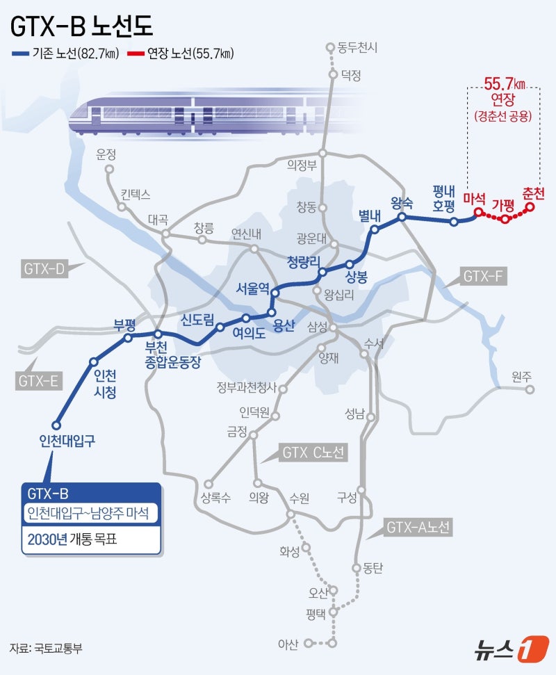 GTX-B 노선도 ⓒ 뉴스1 김지영 디자이너(서울=뉴스1) 김동규 기자 = 수도권광역급행철도(GTX) 사업이 가시적인 진전을 보이고 있다. GTX-A노선은 연내 전 구간 직결 운행 체계 …